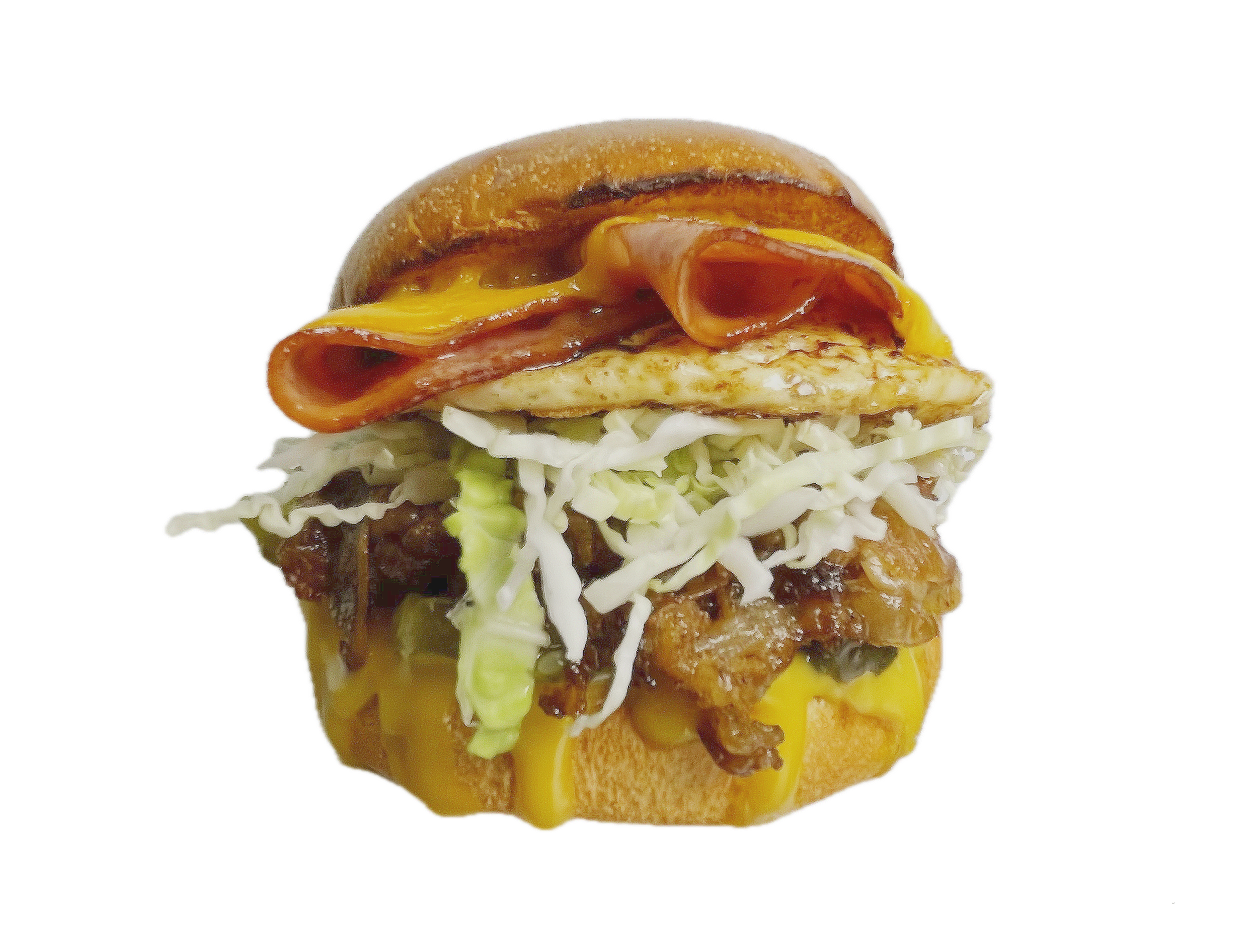 Sukiyaki Beef, Ham, Fried Egg, Provolone, Cheddar, Sweet Heat Chips, Shredded Cabbage and Honey Mustard on a Brioche Bun.