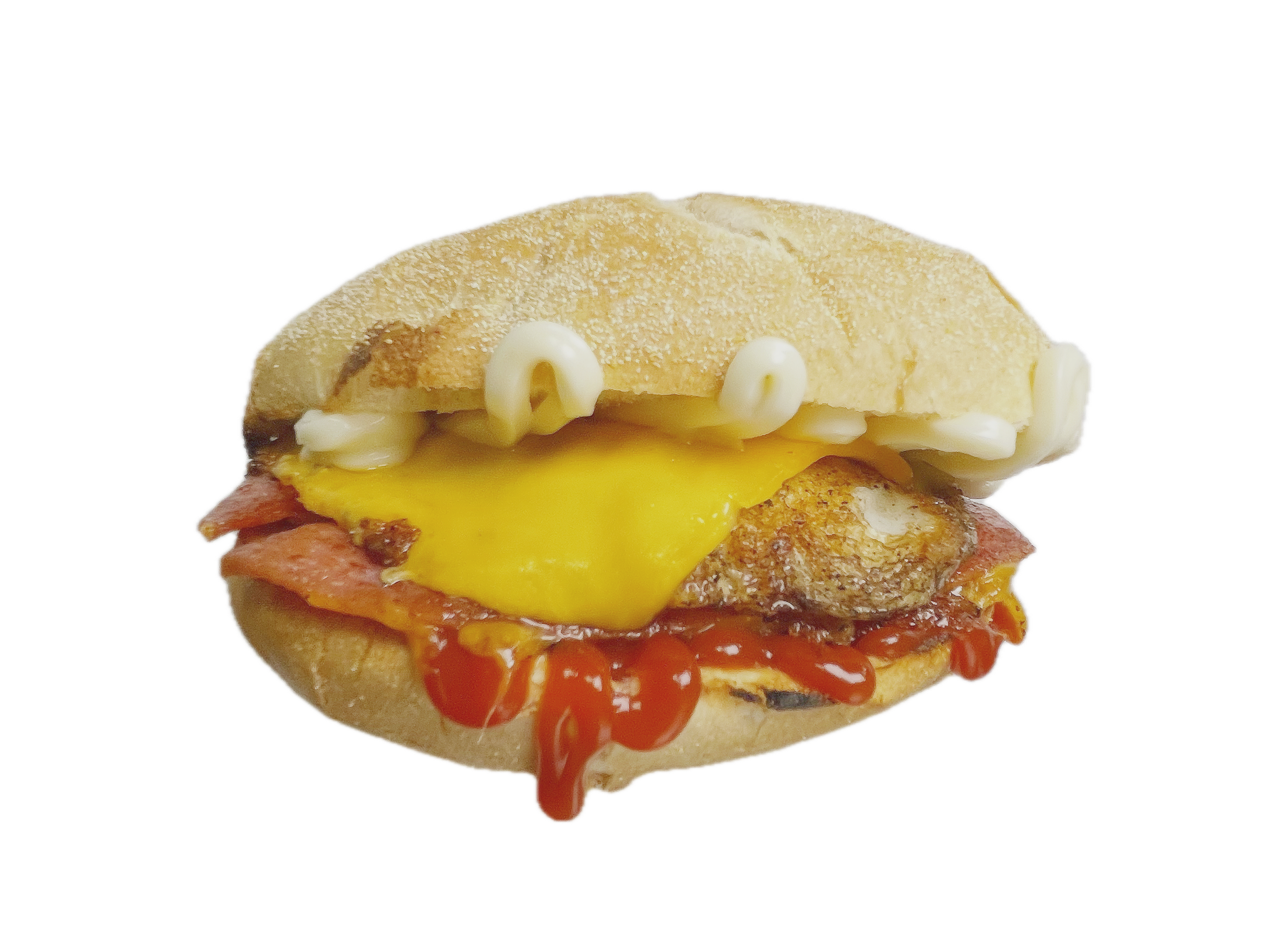Sausage patty, Bacon, Hashbrown, Fried Egg, Cheddar, Provolone, Kewpie Mayo and Ketchup on a toasted Brioche Bun