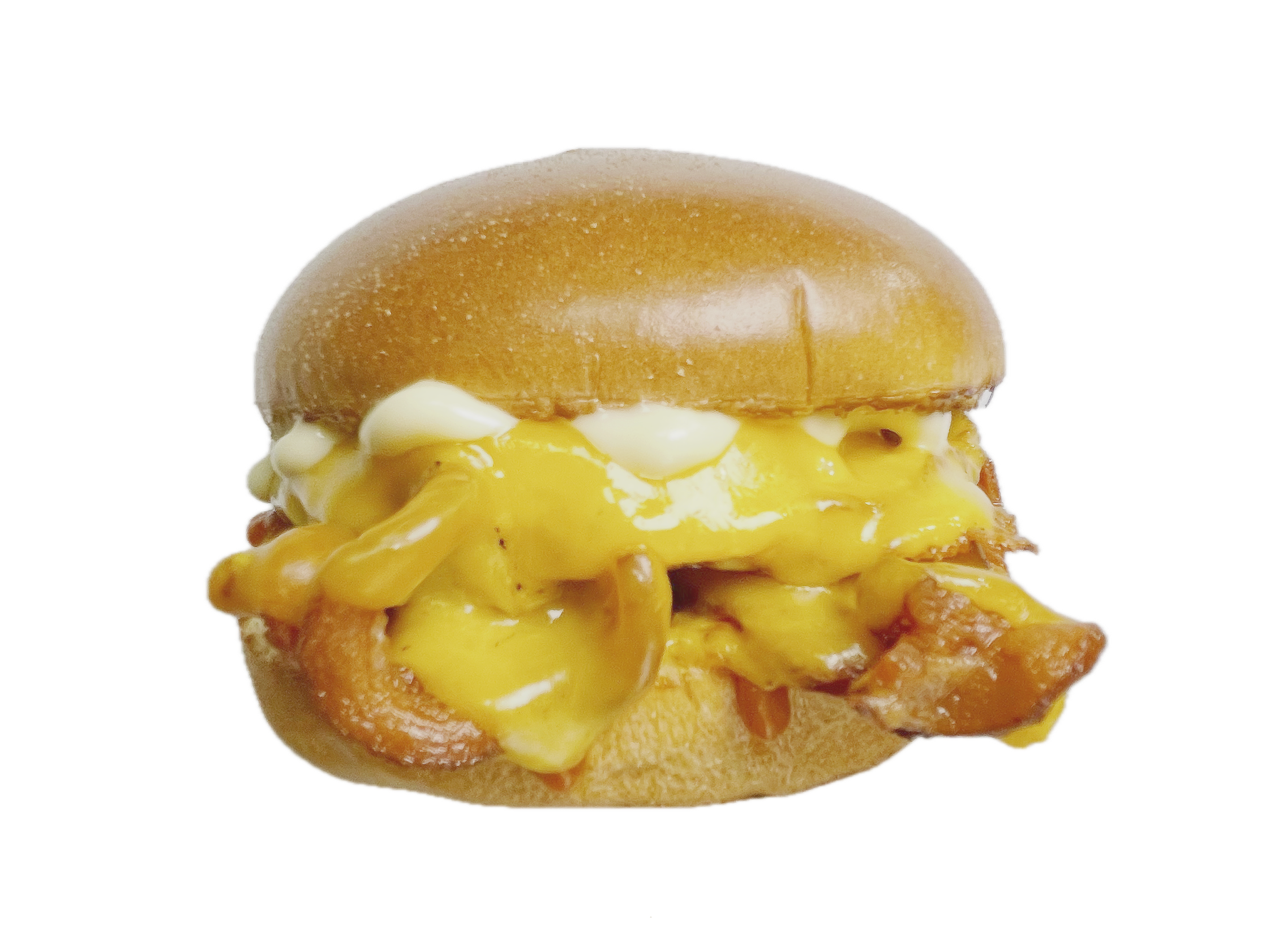 Pork Sausage Patties, Fried Egg, Cheddar, Provolone, Katsu Sauce and Kewpie Mayo on a toasted Brioche Bun.