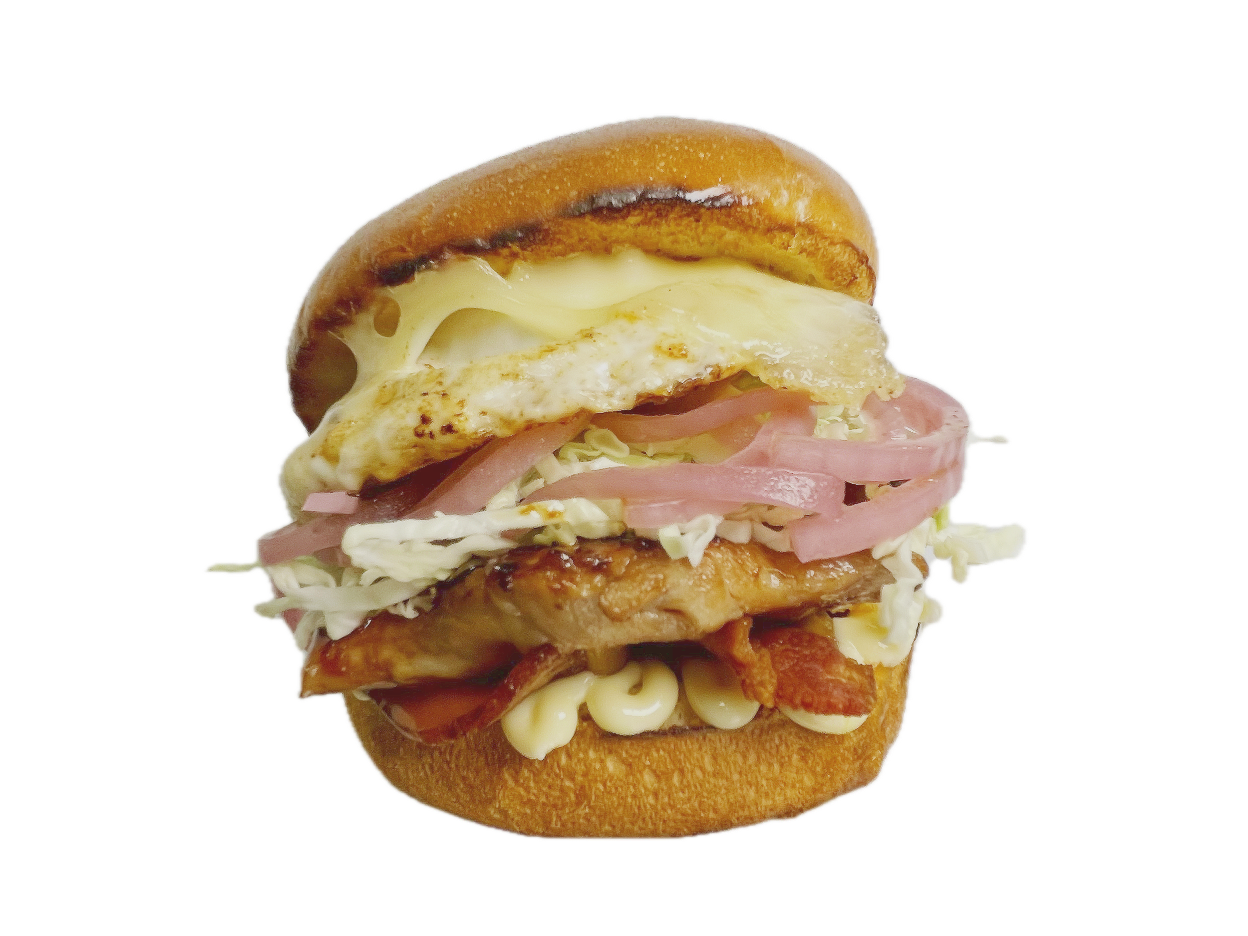 Chicken Teriyaki, Bacon, Shredded Cabbage, Red Onion Oregano, Fried Egg, Swiss, Cheddar and Kewpie Mayo on a toasted Brioche Bun.